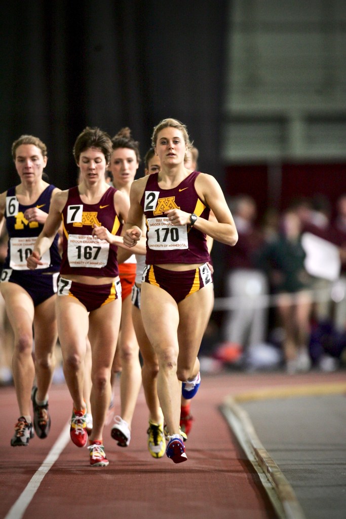 Minnesota had a heck of a team, too—and they were on their home track. Heather Kampf was one of many Gophers in more than one event, entering the mile, the 600 meters, and the 4 x 400-meter relay. Kampf was already the school’s most decorated runner. As a freshman, she had won the indoor N.C.A.A. title at 800 meters, becoming the school’s first national champion. By the time she graduated, she was an eight-time All-American and owned ten school records. But the first weekend of March in 2008, none of that mattered. She was simply running for as many points as possible. Minnesota was the defending champions, but winning at home would make it extra sweet. Doubling was no easy task, however. At that point, the men’s and women’s events were held in different locations. With no men’s 60 meters or 5,000 meters held before or after the women’s version of each race, there was less time between events—which, in turn, meant there was less time to rest.