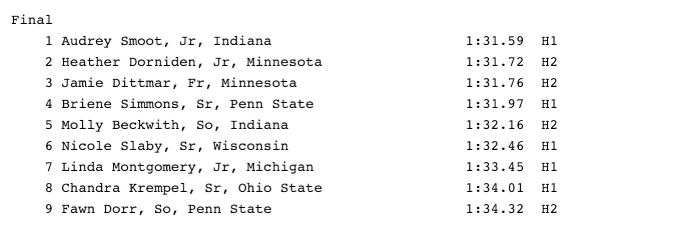 She wouldn’t be in the slow heat of the 600, though. And that was important, the team race was turning into a three-team battle between Minnesota, Michigan, and Penn State. Dorr needed all the points she could get.