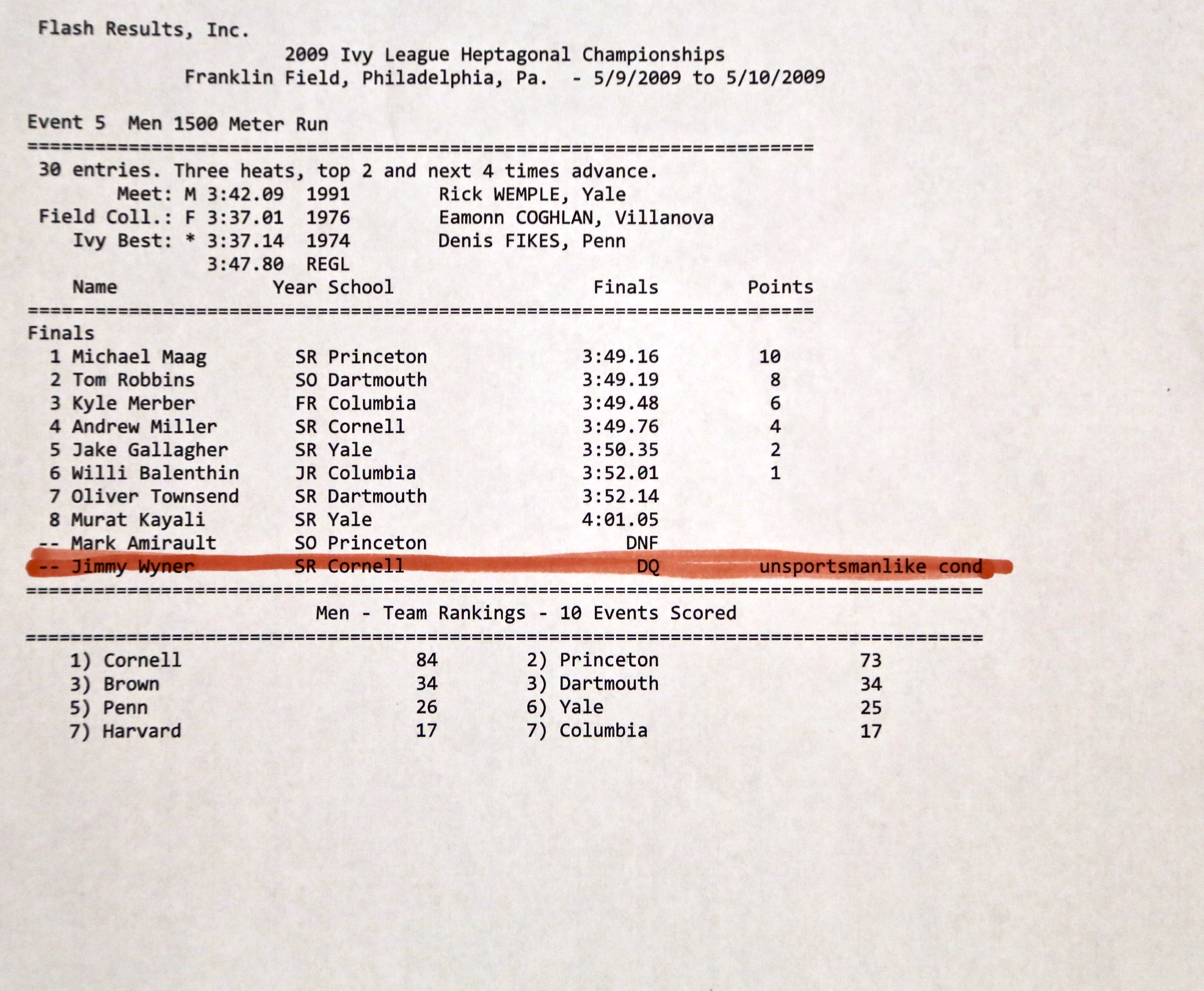 Nearly a lifetime (in running years) later, Jimmy Wyner does still think about the race. “It was definitely a trip,” he wrote to me when I first contacted him about the 2009 Heps 1,500 final.